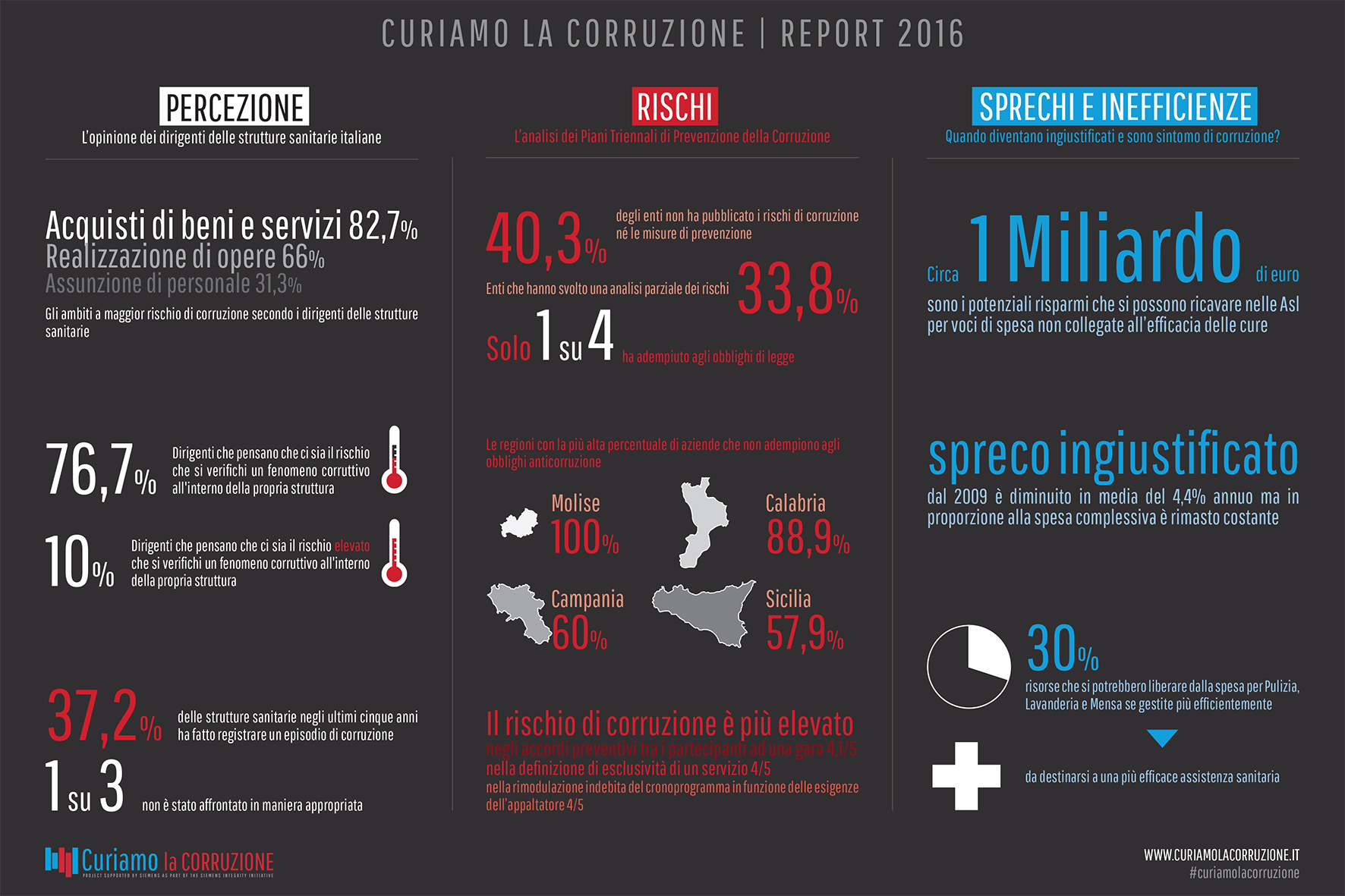 Il rapporto spiega con efficacia che le voci di spesa per beni e servizi che non incidono direttamente sull’assistenza sanitaria e non sono collegati all’efficacia dell’intervento, come quelle per la mensa, la lavanderia e la gestione dei rifiuti speciali, assorbono risorse consistenti. Voci apparentemente minori, che costituiscono l’1,5% della spesa sanitaria nazionale, ma dove nei fatti si annidano spreco e corruzione per ben un 29% di spese ingiustificate. Dall’analisi dei conti di Asl e Aziende ospedaliere emerge che dal 2009 al 2013 gli sprechi sono diminuiti in media del 4,4% l’anno, ma la loro incidenza rispetto alla spesa complessiva non si è ridotta: ammontano a 1 miliardo di euro l’anno. Il rapporto informa inoltre che molto è stato fatto per prevenire i casi di corruzione in ambito sanitario. Il 97% delle strutture sanitarie ha adottato uno specifico Codice di comportamento dei dipendenti, il 93% ha predisposto un regolamento per le procedure d’acquisto e l’85% ha previsto procedure per la segnalazione di casi di corruzione e azioni a tutela dei dipendenti che le effettuano (i whistleblower). Ma l’esame dei Piani anticorruzione, previsti dalla L. 190/2012, rivela però che nel 40% dei casi ci si è limitati a un adempimento formale dell’obbligo di legge.