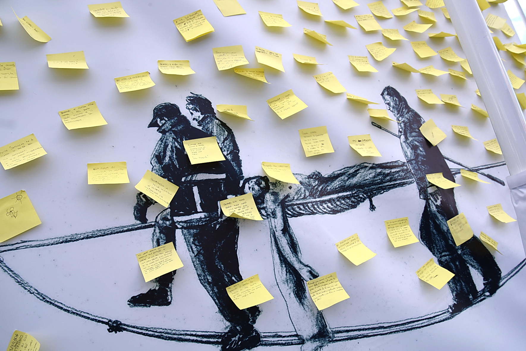 Thousands of yellow post-its, small enough to contain a message, a sentence, or just a few words. Unsigned prayers, confessions, commitments, memories – also painful ones – were entrusted to these small paper squares that for three days resisted to the strong winds that tried to tear them away from the white tableaus where they had been posted. The account of the Jubilee pilgrimage of 70 thousand boys and girls, arrived to Rome from world countries, also takes place in the passage across the seven Tents of Mercy. In each one of them young boys and girls have tried to learn more about the works of mercy in order to put them into practice in their daily lives. There emerges a picture of young people “who are much stronger than we imagine”