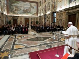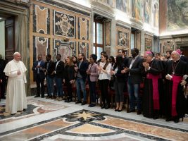“La vostra voce – debole, ma forte della speranza e del coraggio della giovinezza – possa essere ascoltata il prossimo 10 dicembre alle Nazioni Unite” ha detto il Pontefice ai giovani presenti. “Servono leader con una nuova mentalità. Non sono leader di pace quei politici che non sanno dialogare e confrontarsi: un leader che non si sforza di andare incontro al ‘nemico’, di sedersi con lui a tavola come fate voi, non può condurre il proprio popolo verso la pace. Per far questo occorre umiltà, non arroganza: san Francesco vi aiuti a seguire questa strada, con coraggio. Spero che i vostri leader vengano a Rondine, e vedano come i loro giovani preparano la pace”. Alla vigilia della partenza della delegazione di Rondine per New York, il Sir ha incontrato il presidente Vaccari con il quale ha fatto il punto di 20 anni di storia di Rondine.