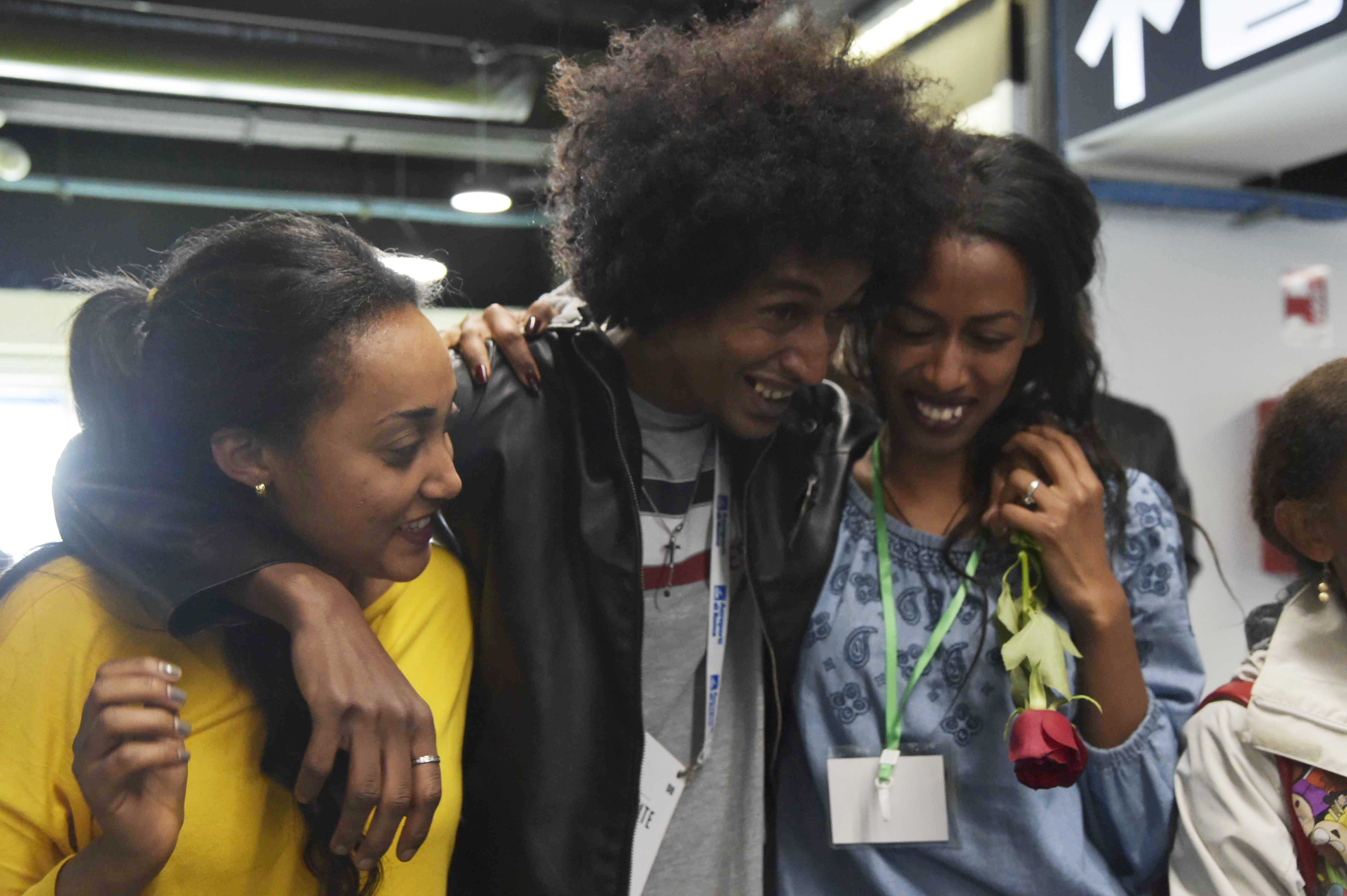 Jay, 28 anni, ha un rosa rossa in mano che racchiude tutte le sue emozioni, pronte ad esplodere in una gioia senza confini. Un cespuglio di capelli ricci neri come l’ebano su un corpo sottile come lo stelo di quella rosa. Aspetta Helen, la sua fidanzata, anche lei eritrea. Non la vede da più di un anno, da quando erano insieme ad Addis Abeba. Mentre la riabbraccia, appena entrata all’aeroporto di Fiumicino grazie ai corridoi umanitari, la rosa rossa cade in terra, dimenticata sul pavimento azzurro. I due si confondono in un unico abbraccio. La commozione è forte. Sono lacrime di gioia, sorrisi, carezze, emozioni trattenute a lungo divenute ora finalmente realtà. Un momento che, dopo tanto dolore, resterà per sempre nella loro memoria.