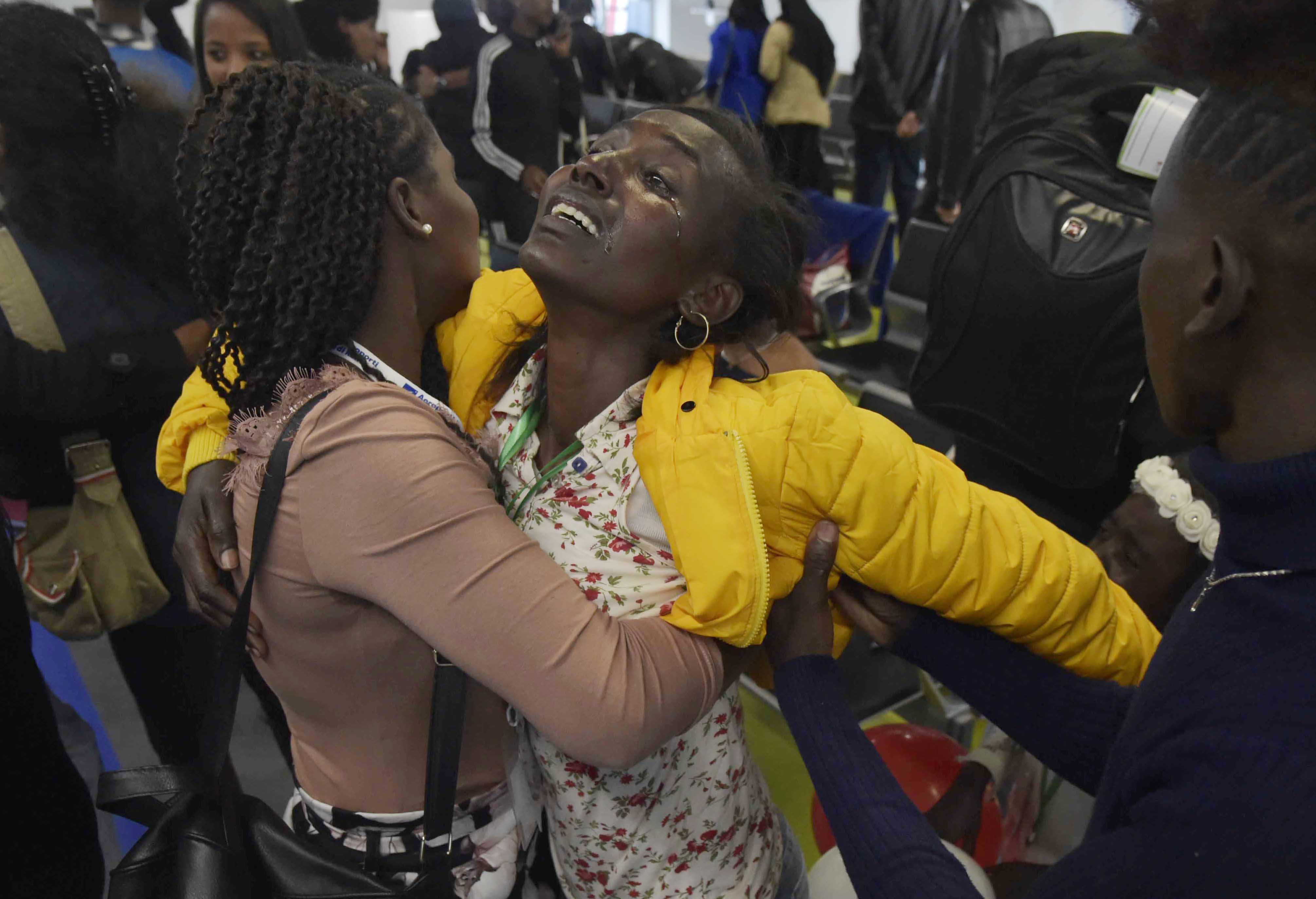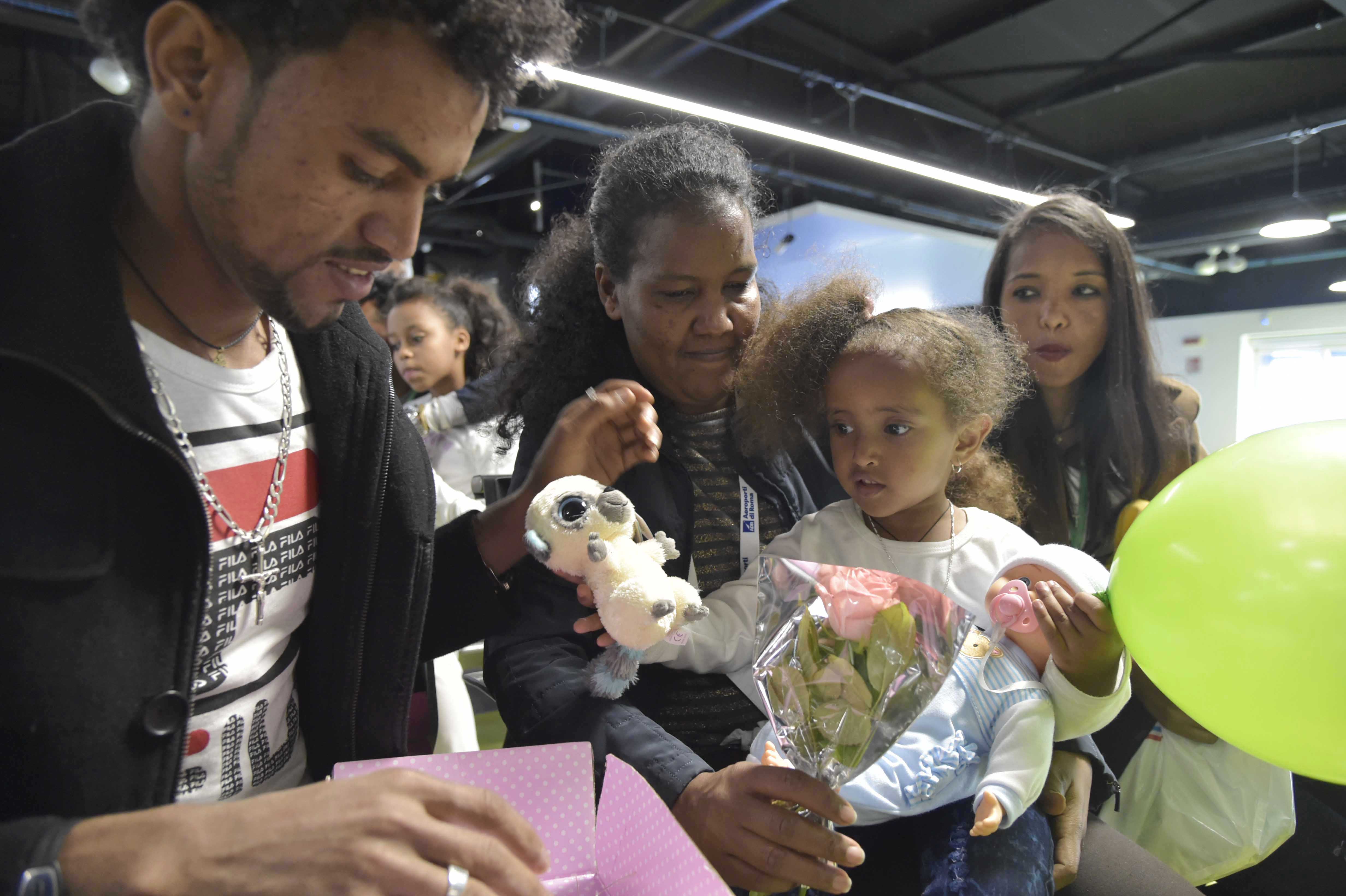 C’è Sannait, 35 anni. I suoi capelli lunghi, lisciati la fanno assomigliare più ad una latinoamericana che ad una eritrea. Oggi ha potuto riabbracciare la sorella che non vedeva da 8 anni. L’altra faccia della medaglia è Janeth, arrivata dal mare 11 anni fa, vive a Roma e fa la domestica. Il suo pianto è un misto di felicità e tristezza perché oggi ha ritrovato il cognato e la nipotina di 7 anni e mezzo ma non la sorella, morta di tumore un anno fa. Storie belle, uniche come lo è ogni vicenda umana. È il miracolo dei ricongiungimenti familiari, oggi resi possibili grazie alla prima ondata del secondo Protocollo d’intesa con lo Stato italiano, firmato il 3 maggio dalla Cei (che agisce tramite Caritas italiana e Fondazione Migrantes) e dalla Comunità di Sant’Egidio. Un accordo, il secondo, che prevede l’arrivo di 600 persone nei prossimi due anni. Col primo protocollo, infatti, sono giunte in Italia, accolti in strutture protette, già 500 persone, molte delle quali ritrovando i loro cari dopo anni di separazione forzata. Quelli di oggi sono atterrati all’alba a Roma con un volo dall’Etiopia: un gruppo di 51 persone, tra cui 14 bambini, composto da 8 somali, 2 sudanesi e 41 eritrei. Sorelle, fratelli, mariti, mogli, figli, nipoti di altri già residenti in Italia da tempo, tutti in attesa di questo abbraccio. Roma, Bologna, Firenze, Genova, Gubbio, Martina Franca, Milano e Padova le loro città di destinazioni. Saranno ospitati in appartamenti di privati e istituti religiosi, associazioni e parrocchie della rete di supporto della Comunità di Sant’Egidio. Frequenteranno corsi di italiano e saranno seguiti da famiglie italiane nel percorso di integrazione sociale. Un progetto a tutto tondo finanziato interamente dall’otto per mille della Cei e da fondi raccolti tra le realtà coinvolte.