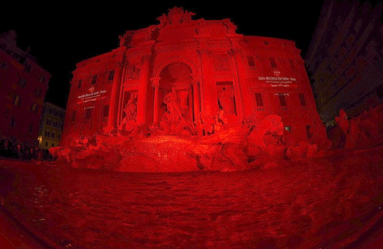 La Fontana di Trevi in rosso per i cristiani perseguitati: il sangue dei martiri non è un film