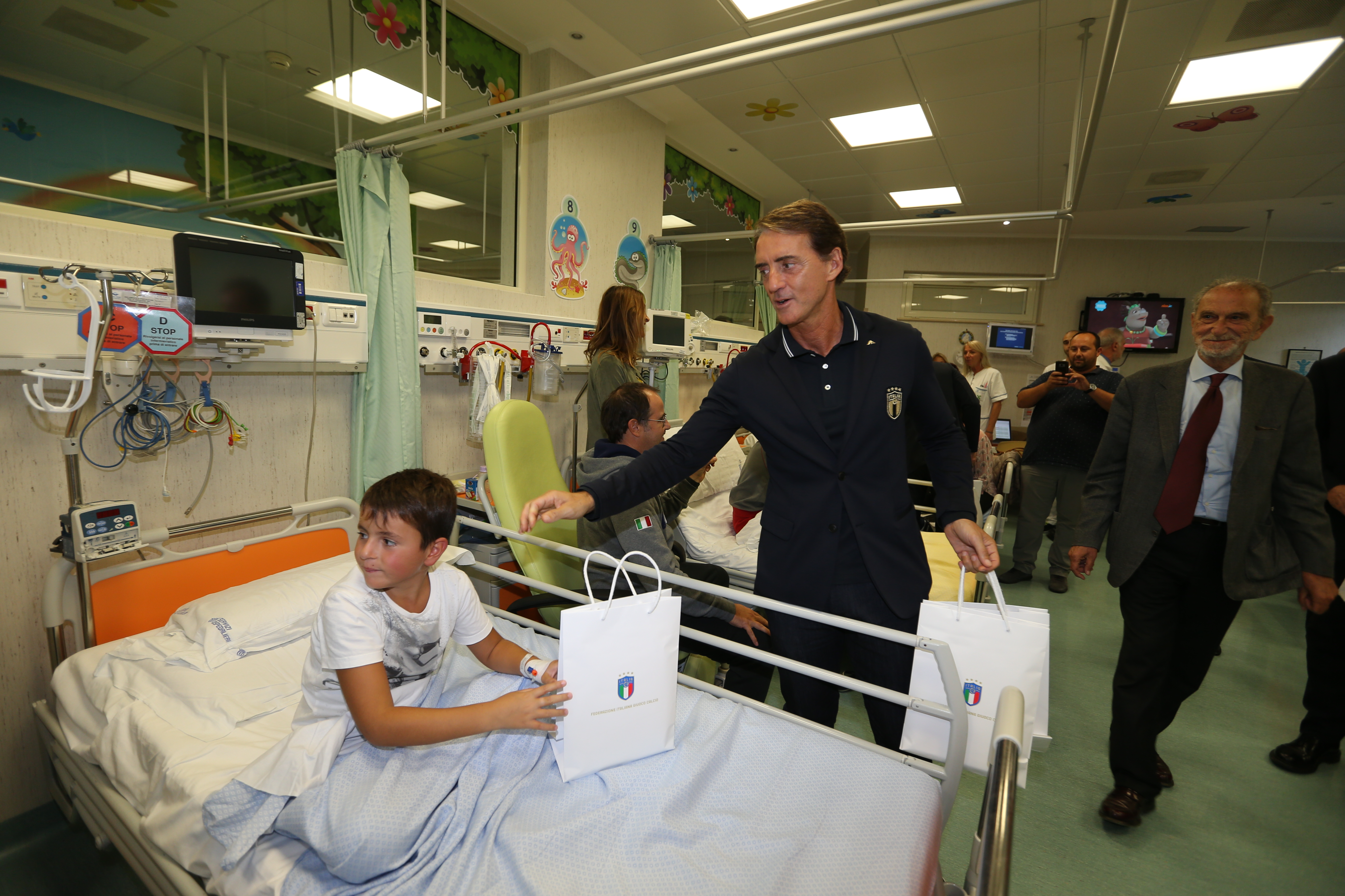 Grande festa per tanti bambini ricoverati all’ospedale Bambino Gesù di Roma: hanno potuto incontrare ieri i campioni della Nazionale di calcio italiana. Si tratta di una delle iniziative promosse dalla Figc per sostenere la realizzazione dell’Istituto dei Tumori e dei trapianti. La squadra, accompagnata dal ct Robero Mancini, ha ricevuto in dono un pallone con le firme dei bambini ricoverati oltre a due pettorine decorate con i disegni della ludoteca, che verranno indossate nel riscaldamento pre-partita di Italia-Grecia. La grande comunità del Bambino Gesù sarà invece ospite della Figc allo stadio per la gara di sabato tra Italia e Grecia. Oltre 5mila, tra pazienti, familiari, dipendenti e volontari dell’ospedale, saranno in tribuna all’Olimpico. La squadra, suddivisa in gruppi, all’arrivo all’ospedale al Gianicolo ha incontrato i bambini e i ragazzi ricoverati nei diversi reparti. I giocatori, dopo aver visitato i vari reparti, si sono intrattenuti con altri piccoli pazienti nell’area giochi. All’arrivo del ct Mancini e del presidente Gravina i bambini hanno cantato l’Inno di Mameli, raccogliendo gli applausi della delegazione azzurra. Poi il ct ha giocato con i piccoli pazienti, facendosi tirare alcuni calci di rigore.