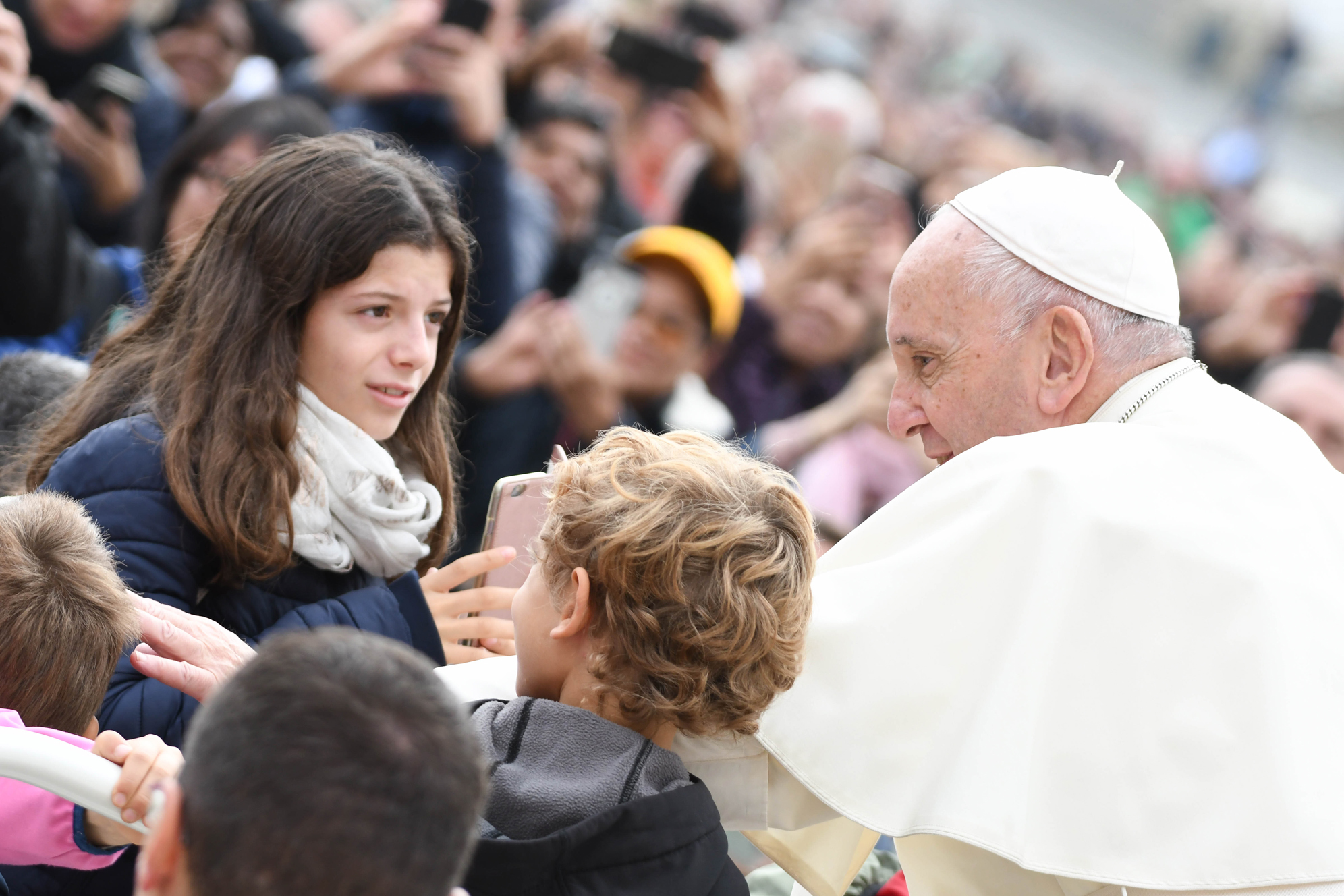 Papa Francesco ha fatto il suo ingresso oggi in piazza San Pietro, per l’udienza generale del mercoledì, intorno alle 9 e lungo il percorso transennato ha fatto più volte fermare la jeep bianca scoperta per salutare, baciare e benedire i bambini, alcuni di pochi mesi. Come sempre sulla papamobile sono saliti dei bambini che hanno accompagnato il Papa fino al sagrato, filmando questo indimenticabile “viaggio” nel cuore di Roma e in mezzo alla folla con i telefonini. Migliaia i pellegrini presenti in questa ultima giornata di ottobre. Al passaggio del Papa hanno intonato cori di saluto. Sono presenti gruppi anche da Gerusalemme, Filippine, Stati Uniti.