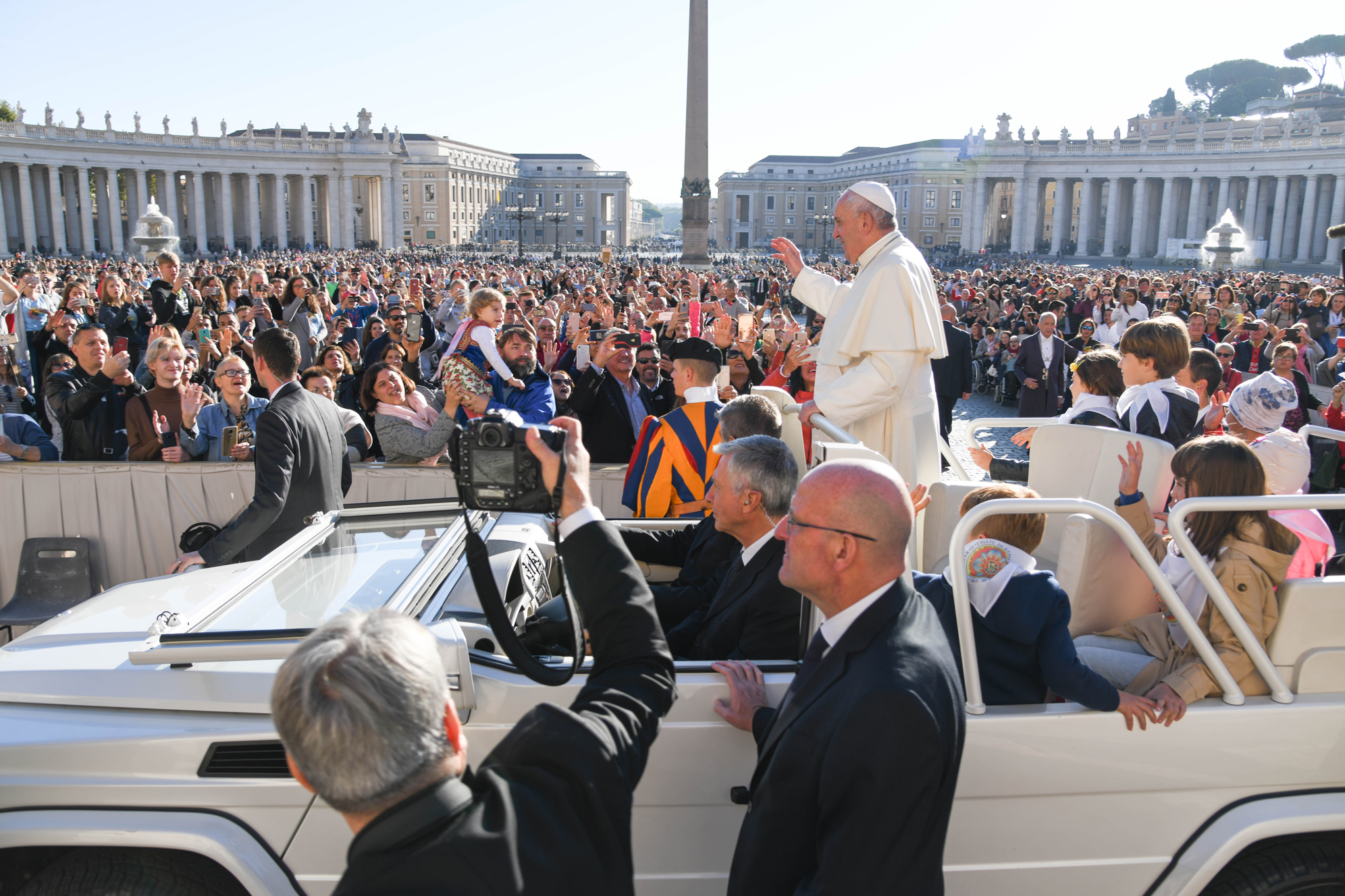 Il Papa ha fatto il suo ingresso oggi in piazza San Pietro intorno alle nove e subito ha fatto fermare la jeep bianca scoperta per far salire a bordo cinque bambini, che durante il tragitto nei vari settori della piazza hanno salutato anche loro la folla di 17mila fedeli che oggi riempie piazza San Pietro, godendosi il loro viaggio straordinario. Tra i molti bambini che, come di consueto, Francesco ha baciato e accarezzato, grazie alla solerte collaborazione degli uomini della Gendarmeria vaticana, anche un bimbo di pochi mesi “vestito da Papa”, con tanto di zucchetto, talare bianca e mantellina. Molte le bandiere multicolori che sventolano in questa splendida giornata di “ottobrata romana”: tra queste, anche quella della Corea del Sud, presente con un gruppo di una quarantina di pellegrini. Non è mancata una sosta per sorseggiare il mate, durante la quale Francesco si è fermato a dialogare con la ragazza che gli ha offerto la bevanda tipica argentina. Al termine del giro tra i vari settori della piazza, il Papa si è congedato dai suoi piccoli ospiti facendoli scendere dalla papamobile e salutandoli uno ad uno, prima di scendere per compiere a piedi l’ultimo tratto che lo separa dalla sua postazione al centro del sagrato. La tradizionale udienza generale del mercoledì in piazza San Pietro è l’unico impegno pubblico di oggi. Tutto il resto della giornata sarà dedicato alla partecipazione al Sinodo per l’Amazzonia, in corso in Vaticano fino al 27 ottobre.