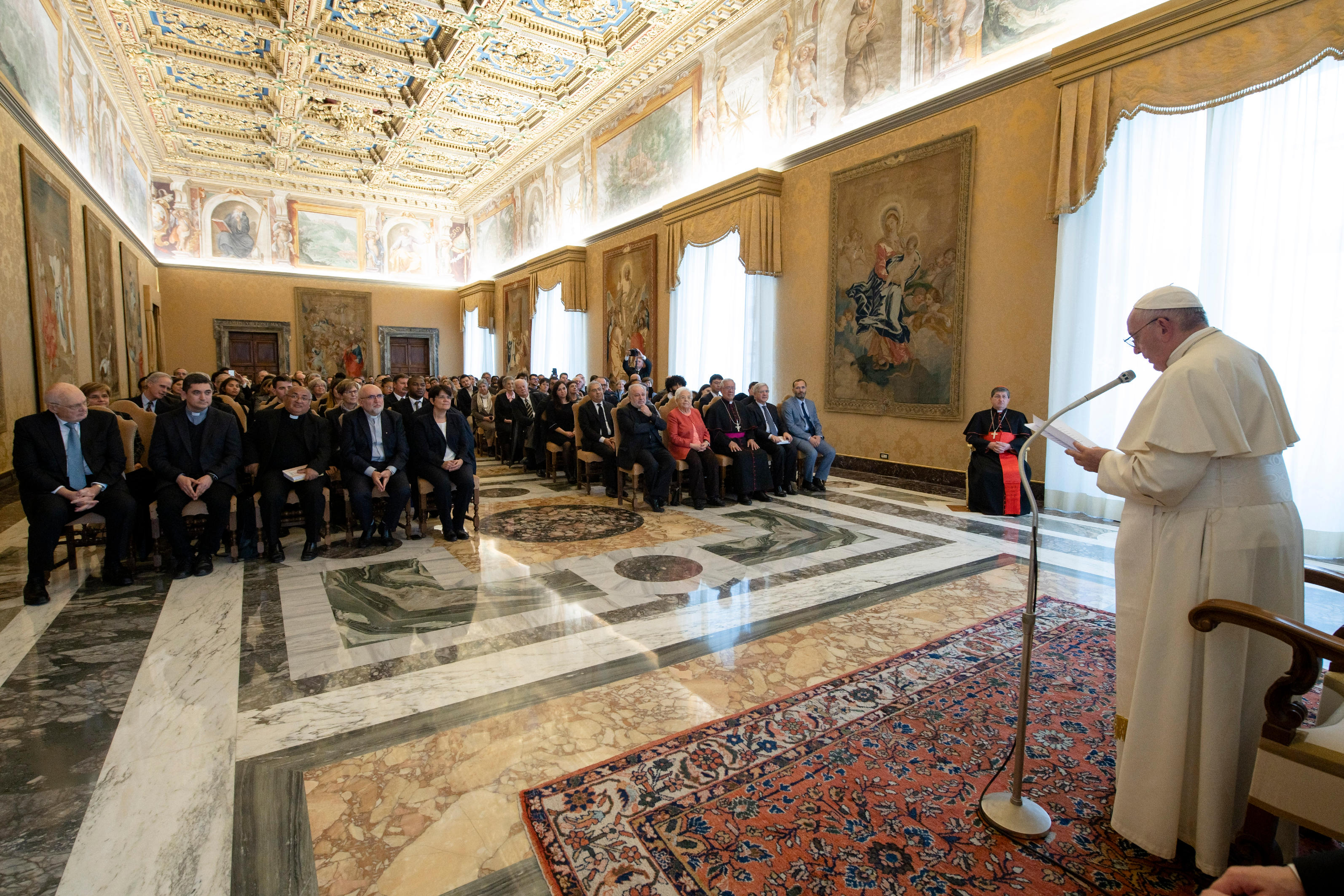 “Wisdom, covenant, outgoing”. These are the three keywords suggested by Pope Francis to the academic community of the Sophia University Institute of Loppiano, received in audience today. “Your University is called ‘Sophia’ because its objective is first of all to communicate and learn wisdom in order to infuse all its sciences”, Pope Francis remarked: “Wisdom is in fact the Light of the countenance of God that illuminates the face of man: his mystery, his questions, his sufferings, his destiny. For us Christians, wisdom is Jesus crucified and risen, but His light illuminates all men: all religions, all cultures, all authentic exercises of humanity. For this reason, we are called to walk together with each other – as you do – to build a true and harmonious culture of encounter”. “There are some people who have this habit: to find someone they can ‘walk against’”, he added off the cuff: “Our message is different – it is to find ‘who’ to ‘walk with’”, he added off the cuff. “The covenant – the Pope explained about the second keyword – is the keystone of creation and history, as the Word of God teaches us: the covenant between God and men, the covenant between generations, the covenant between peoples and cultures, the covenant – in school – between teachers and learners, the covenant between man, animals, plants and even the inanimate realities that make our common home beautiful and colourful. Everything is related to everything else, everything is created to be a living icon of God Who is the Trinity of Love! Today, therefore, it is a priority task to educate people to live out this covenant, or rather to be this living covenant in all these dimensions: to open the paths of the future to a new civilization that embraces humanity and the cosmos in universal brotherhood”. “This vocation to brotherhood, this living the brotherhood… is something we cannot walk without today”, he added off the cuff. “Without going out – he said about the third keyword – one does not encounter wisdom, without going out the covenant does not spread to all, in ever wider and more inclusive concentric circles. Only by going out does one encounter the real face of our brothers and sisters, with their wounds and aspirations, their questions and their gifts. We must learn with the heart, mind and hands to ‘come out of the camp’ – as the Letter to the Hebrews says – so as to meet, right out there, the face of God in the face of every brother and sister”.