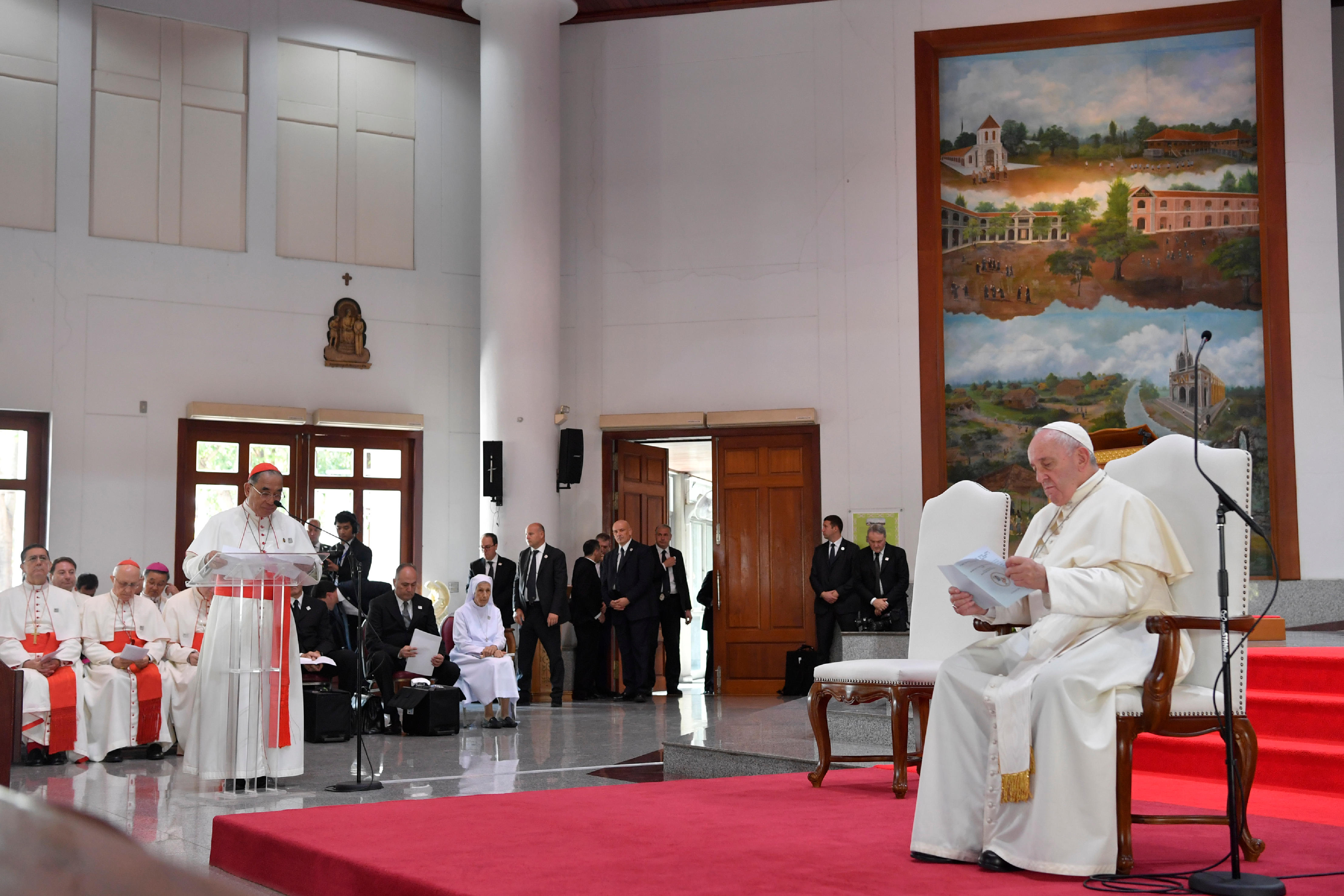 “Quanto dobbiamo imparare da voi, che in tanti dei vostri Paesi o regioni siete minoranza, e non per questo vi lasciate trascinare o contaminare dal complesso di inferiorità o dal lamento di non sentirsi riconosciuti!”. È l’omaggio del Papa ai vescovi della Thailandia, nel discorso loro indirizzato. “Voi sapete molto bene che cos’è una Chiesa piccola in persone e mezzi, ma ardente e con la voglia di essere strumento vivo della promessa del Signore verso tutte le persone dei vostri villaggi e delle vostre città”, ha proseguito Francesco: “Il vostro impegno a portare avanti la fecondità evangelica, annunciando il kerigma con le opere e con le parole nei diversi ambiti dove i cristiani si trovino, è una testimonianza che lascia il segno”. “Non siamo noi a disporre della missione, e tanto meno le nostre strategie”, il monito del Papa. “Il pastore è una persona che, innanzitutto, ama visceralmente il suo popolo, conosce le sue intolleranze, le sue fragilità e i suoi punti di forza”, il ritratto di Francesco, secondo il quale “la missione è certamente amore per Cristo, ma al tempo stesso è una passione per il suo popolo. Ricordiamo che anche noi siamo parte di questo popolo; siamo stati scelti come servitori, non come padroni o signori. Questo significa che dobbiamo affiancare coloro che serviamo con pazienza e amabilità, ascoltandoli, rispettando la loro dignità, incoraggiando e valorizzando sempre le loro iniziative apostoliche”. “Molte delle vostre terre sono state evangelizzate da laici”, ha concluso il Santo Padre: “Essi hanno avuto la possibilità di parlare il dialetto della gente, esercizio semplice e diretto di inculturazione non teorica né ideologica, ma frutto della passione del condividere Cristo. Il santo Popolo fedele di Dio possiede l’unzione del Santo che siamo chiamati a riconoscere, apprezzare e diffondere. Non perdiamo questa grazia di vedere Dio che agisce in mezzo al suo popolo: come lo ha fatto prima, lo fa ancora e continuerà a farlo”. Dopo il saluto dei vescovi e la foto di gruppo, il Papa ha raggiunto la vicina sala conferenze del Santuario, per incontrare in forma privata i membri della Compagnia di Gesù della Thailandia. Quindi è rientrato in auto alla nunziatura apostolica di Bangkok.