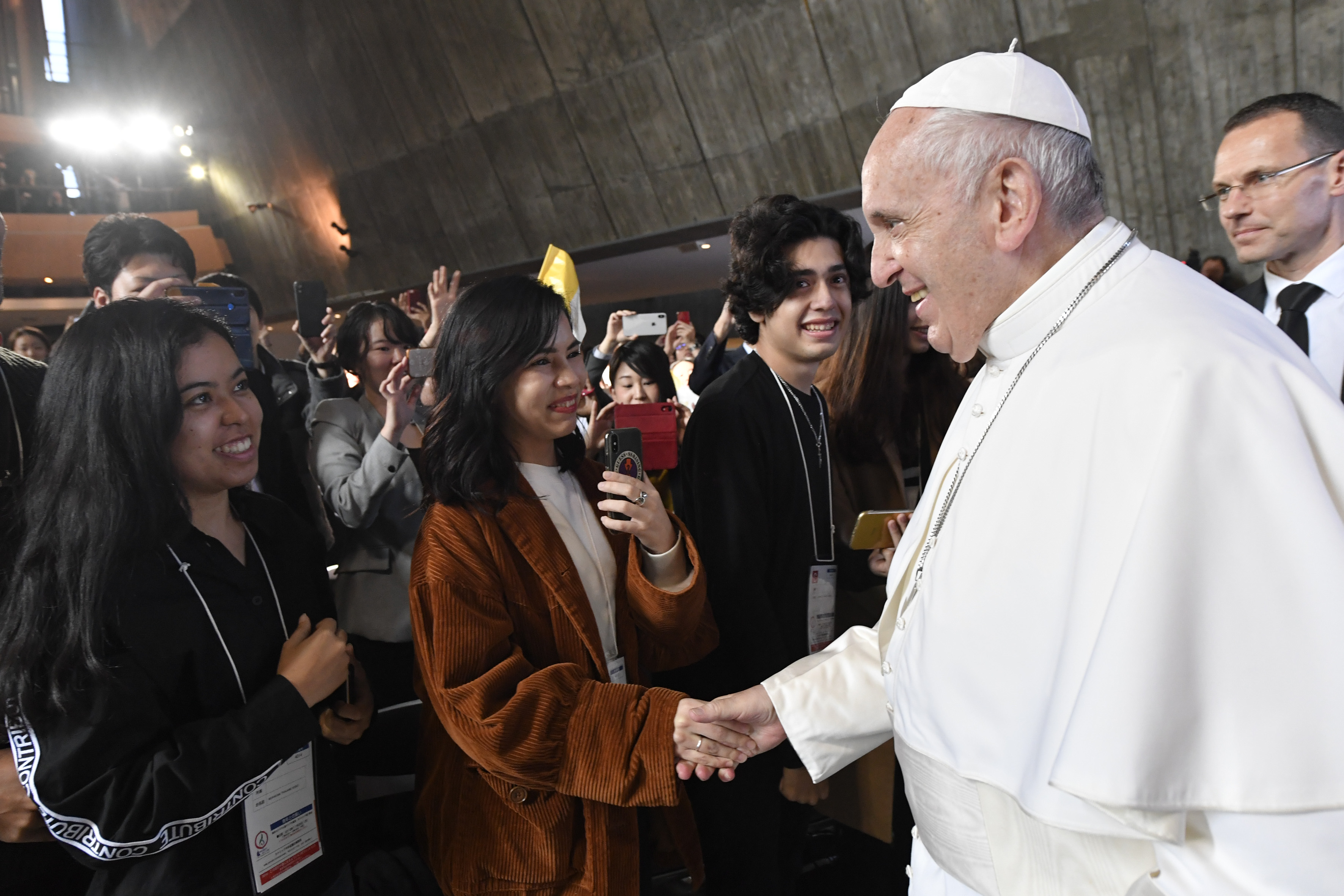 “Impariamo a costruire insieme la società che vogliamo per il domani”. È il primo invito rivolto ai giovani, incontrati nella Cattedrale di Santa Maria Immacolata di Tokyo. “Quando vi guardo – ha detto il Papa, dopo aver ascoltato la testimonianza di tre giovani: un cattolico, un buddista e un migrante – posso vedere la diversità culturale e religiosa dei giovani che vivono oggi in Giappone, e qualcosa della bellezza che la vostra generazione offre al futuro”. “L’amicizia tra di voi e la vostra presenza qui ricorda a tutti che il futuro non è monocromatico, ma che, se ne abbiamo il coraggio, è possibile guardarlo nella varietà e diversità degli apporti che ciascuno può dare”, l’omaggio di Francesco: “Quanto ha bisogno la nostra famiglia umana di imparare a vivere insieme in armonia e pace senza che dobbiamo essere tutti uguali! Quanto abbiamo bisogno di crescere in fraternità, nell’attenzione agli altri e nel rispetto delle diverse esperienze e dei vari punti di vista. Questo incontro è una festa perché stiamo dicendo che la cultura dell’incontro è possibile, non è un’utopia, e che voi giovani avete la speciale sensibilità per portarla avanti”.