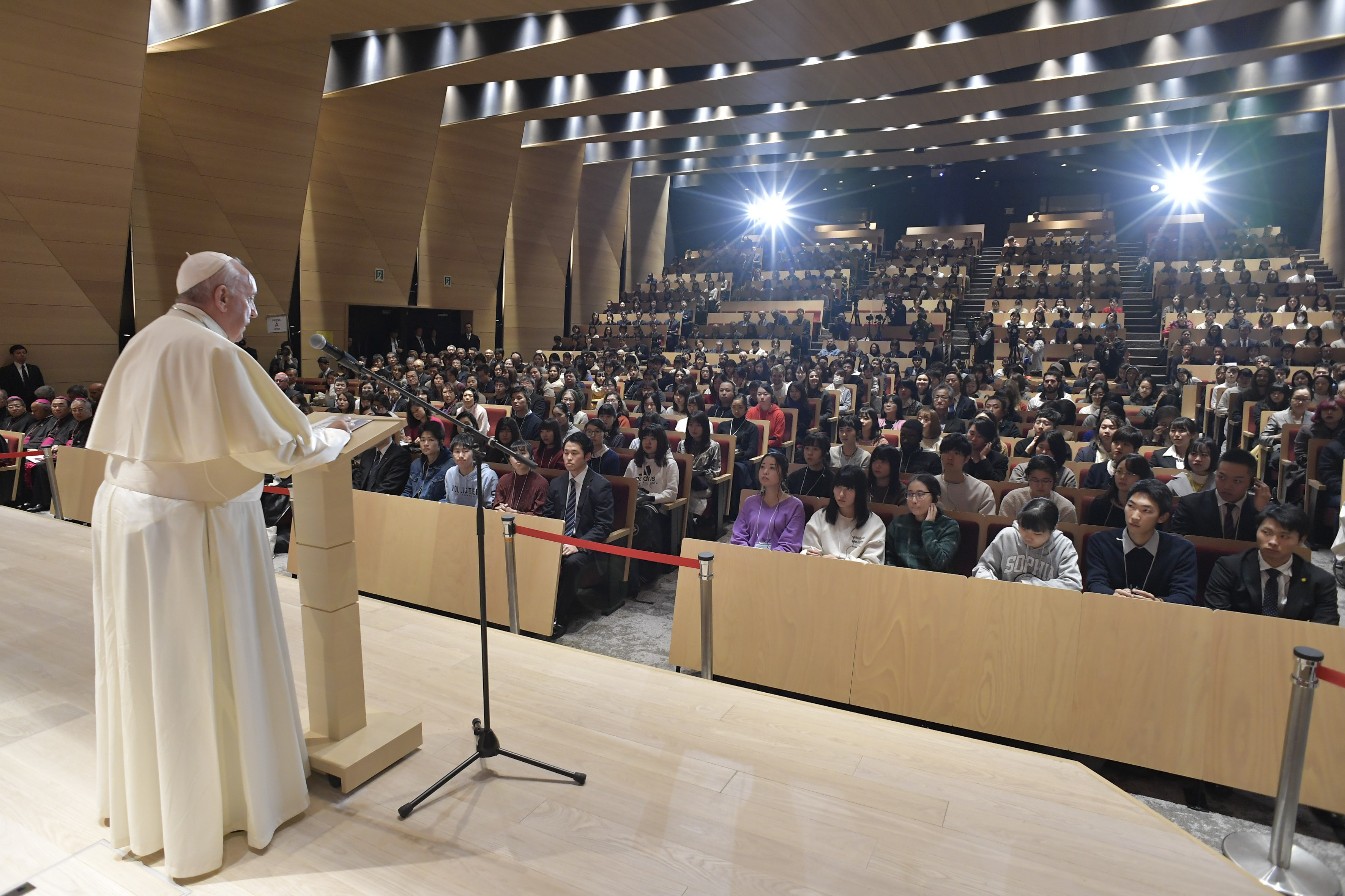 “Poiché le università rimangono il luogo principale in cui vengono formati i futuri leader, occorre che la conoscenza e la cultura in tutta la loro ampiezza ispirino tutti gli aspetti delle istituzioni educative rendendole sempre più inclusive e capaci di generare opportunità e promozione sociale”. È l’auspicio del Papa, che durante la visita alla Sophia University ha chiesto all’ateneo dei gesuiti di “essere non solo un centro di formazione intellettuale, ma anche un luogo in cui una società migliore e un futuro più ricco di speranza possono prendere forma”. “L’amore per la natura, così tipico delle culture asiatiche, qui dovrebbe esprimersi in una preoccupazione intelligente e anticipatrice per la protezione della terra, nostra casa comune”, l’auspicio sulla scorta della Laudato si’: “Preoccupazione che possa coniugarsi con la promozione di una nuova episteme in grado di allargare e mettere in discussione ogni tentativo riduzionista da parte del paradigma tecnocratico”. “L’Università Sophia si è sempre distinta per un’identità umanistica, cristiana e internazionale”, ha ricordato Francesco: “Fin dalla sua fondazione, l’Università è stata arricchita dalla presenza di professori provenienti da diversi Paesi, a volte anche da Paesi in conflitto tra loro. Tuttavia, tutti erano uniti dal desiderio di dare il meglio ai giovani del Giappone. Tale medesimo spirito permane anche nei molti modi in cui voi offrite aiuto a chi ne ha più bisogno, qui e all’estero. Sono certo che questo aspetto dell’identità della vostra università andrà sempre rafforzandosi, in modo che i grandi progressi tecnologici di oggi possano essere messi al servizio di un’educazione più umana, giusta ed ecologicamente responsabile”.
