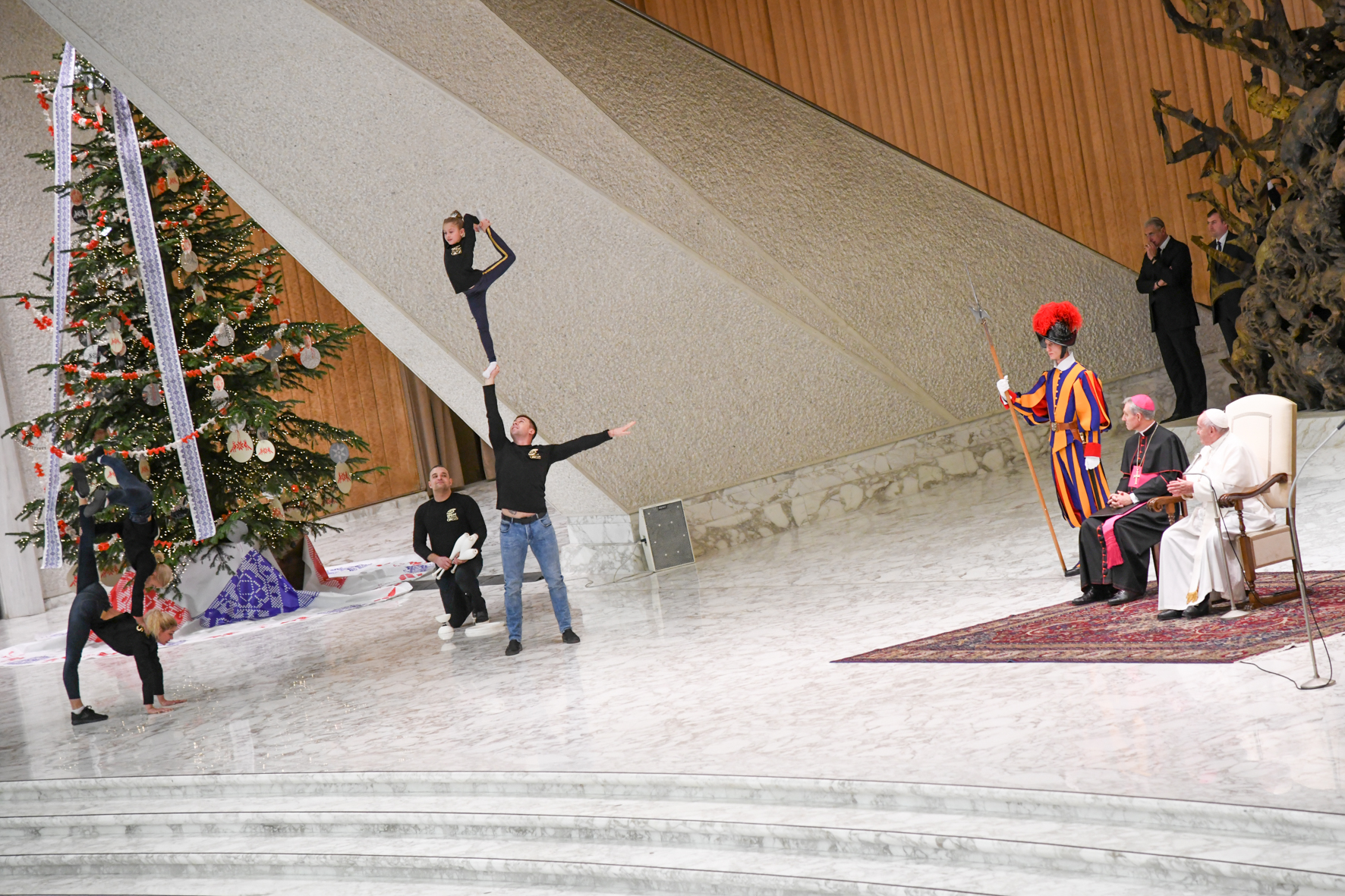 Fuori programma oggi in Aula Paolo VI. Dopo la catechesi e prima dei saluti in lingua italiana che come di consueto concludono l’appuntamento del mercoledì dei fedeli, il Papa ha applaudito divertito ad un’esibizione del Circo di Mosca, il “Great Moscow State City”, i cui giovani artisti e giocolieri hanno eseguito sul palco acrobazie ed evoluzioni, che Francesco ha seguito con interesse e visibilmente apprezzato. Alla fine l’artista più giovane, autrice degli esercizi con il maggiore livello di difficoltà, ha abbracciato calorosamente il Papa e gli ha offerto una delle forcine che servono per raccogliere i capelli durante i numeri acrobatici. Poi, dopo il saluto con gli altri circensi, la bimba biondissima, occhi azzurri color del cielo, è tornata ad abbracciare il Santo Padre mettendosi fiera al suo fianco per guadagnarsi, in solitaria, un’altra “photo opportunity”.