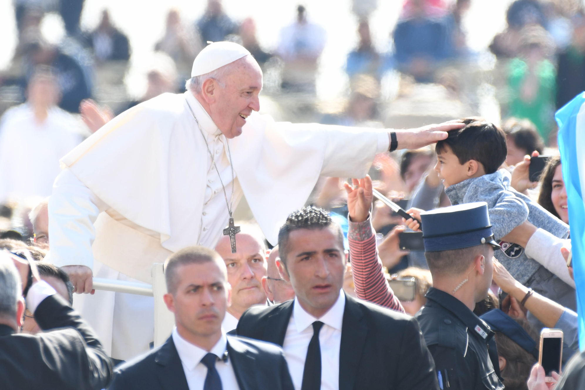 Il Papa ha fatto oggi il suo ingresso in piazza San Pietro alle 9.10 circa, e come ormai è diventata quasi consuetudine ha fatto subito fermare la jeep bianca scoperta per far salire a bordo cinque bambini, quattro femminucce e un maschietto, tutti vestiti con il saio bianco della Prima Comunione. Tra i 20mila fedeli presenti oggi in piazza, anche un gruppo di pellegrini cinesi, alcuni dei quali provenienti dalla diocesi di Shanghai. Terminato il giro tra i vari settori della piazza, acclamato da 20mila fedeli – stando ai dati della Prefettura della Casa Pontificia – Francesco si è congedato dai suoi piccoli ospiti, facendoli scendere e salutandoli uno ad uno, e prima di percorrere a piedi il percorso che lo conduce fino alla sua postazione al centro del sagrato è tornato indietro verso la prima fila delle transenne, richiamato a gran voce da un gruppo di militari, per salutarli.